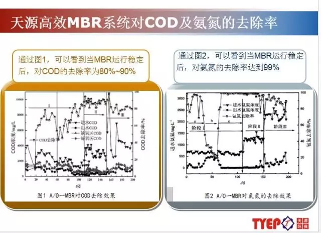天源環(huán)保有10多年的深入摸索,對內置式MBR,外置式MBR分別具備大量工程應用,對其優(yōu)缺點很明顯,并且針對性解決各自的瓶頸問題。由上圖可以看到當MBR運行穩(wěn)定后,對COD的去除率為80%~90%,對氨氮的去除率達到99%。