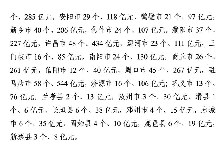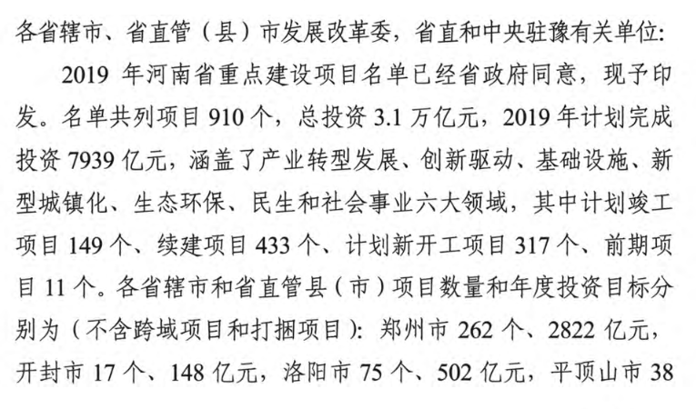 2月11日,河南省發(fā)改委發(fā)布《關(guān)于印發(fā)2019年河南省重點(diǎn)建設(shè)項(xiàng)目名單的通知》。名單共列項(xiàng)目910個(gè),總投資3.1萬億元,2019年計(jì)劃完成投資7939億元,涵蓋了產(chǎn)業(yè)轉(zhuǎn)型發(fā)展、創(chuàng)新驅(qū)動(dòng)、基礎(chǔ)設(shè)施、新型城鎮(zhèn)化、生態(tài)環(huán)保、民生和社會(huì)事業(yè)六大領(lǐng)域18個(gè)行業(yè)。其中計(jì)劃竣工項(xiàng)目149個(gè)、續(xù)建項(xiàng)目433個(gè)、計(jì)劃新開工項(xiàng)目317個(gè)、前期項(xiàng)目11個(gè)。