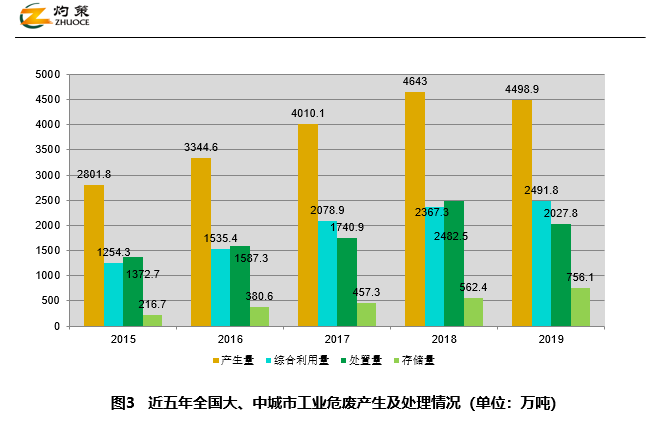 2014-2018年,我國(guó)196個(gè)大、中城市工業(yè)危廢產(chǎn)量持續(xù)上升,綜合利用量和處置量增幅不大;2019年產(chǎn)生量有所回落,為4498.9萬(wàn)噸,綜合利用量為2491.8萬(wàn)噸,處置量2027.8萬(wàn)噸,貯存量756.1萬(wàn)噸,歷年貯存量持續(xù)上升。