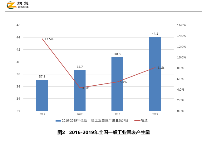 我國(guó)主要固體廢棄物中,一般工業(yè)固體廢棄物產(chǎn)生量最大。一般工業(yè)固體廢物,系指在工業(yè)生產(chǎn)活動(dòng)中產(chǎn)生的除危險(xiǎn)廢物之外的工業(yè)固體廢物。據(jù)《2016—2019年全國(guó)生態(tài)環(huán)境統(tǒng)計(jì)公報(bào)》,全國(guó)一般工業(yè)固體廢物產(chǎn)生量逐年上升,由2016年37.1億噸上升為2019年44.1億噸,上升了18.7%;一般工業(yè)固體廢物綜合利用量、處置量總體上升,2016 年分別為 21.1、8.5 億噸,2019 年分別為 23.2、11 億噸。