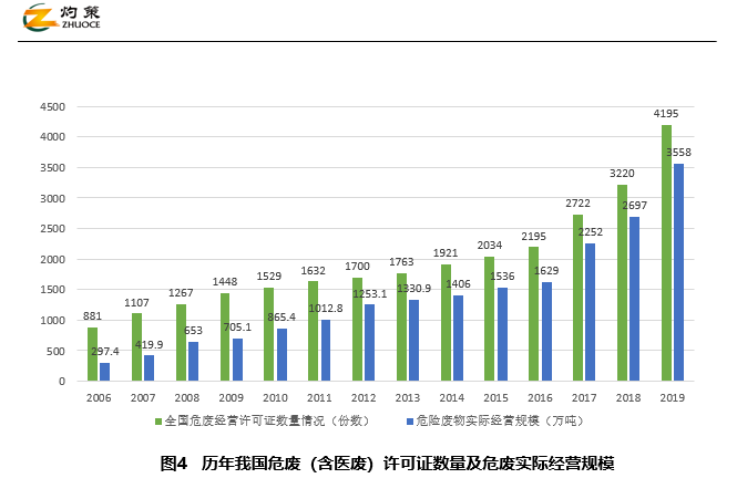 我國(guó)危廢處理行業(yè)的經(jīng)營(yíng)規(guī)模在逐年增長(zhǎng),據(jù)《年報(bào)》,截至2019年底,全國(guó)危險(xiǎn)廢物許可證持證單位共4195個(gè),同比增長(zhǎng)30.3%。其核準(zhǔn)收集和利用處置能力達(dá)到12896萬(wàn)噸/年(含單獨(dú)收集能力1826萬(wàn)噸/年);2019年度實(shí)際收集和利用處置量為3558萬(wàn)噸(含單獨(dú)收集81萬(wàn)噸)。與2006年相比,2019年危險(xiǎn)廢物持證單位核準(zhǔn)收集和利用處置能力、危險(xiǎn)廢物實(shí)際收集和利用處置量分別增長(zhǎng)1709%和1098%。