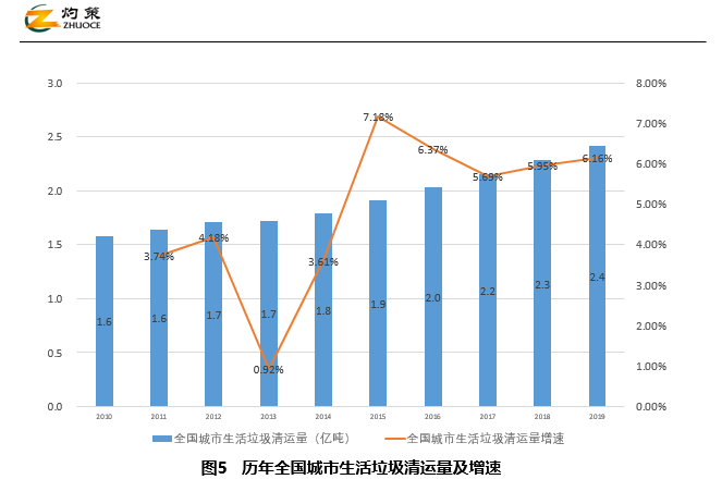 據(jù)統(tǒng)計(jì),全國(guó)城市生活垃圾清運(yùn)量持續(xù)增長(zhǎng),2019年達(dá)2.4億噸,按近四年平均6%左右的增速計(jì)算,預(yù)測(cè)2020年達(dá)2.6億噸,2025年達(dá)3.4億噸。