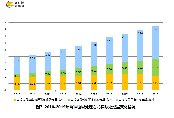 2019年,全國(guó)城市生活垃圾無(wú)害化處理廠數(shù)達(dá)1183座,焚燒無(wú)害化處理量達(dá)1.22億噸,填埋無(wú)害化處理量為1.09億噸。垃圾焚燒發(fā)電、垃圾衛(wèi)生填埋等固廢處理行業(yè)的細(xì)分領(lǐng)域市場(chǎng)逐漸走熱,吸引著越來(lái)越多的企業(yè)參與?!笆濉逼陂g,全國(guó)城鎮(zhèn)生活垃圾無(wú)害化處理建設(shè)總投資約2518.4億元,其中無(wú)害化處理設(shè)施建設(shè)投資1699.3億元,占投資總額的67.48%。目前,全國(guó)城市生活垃圾無(wú)害化處理率已達(dá)99%,垃圾無(wú)害化處理能力趨于飽和。