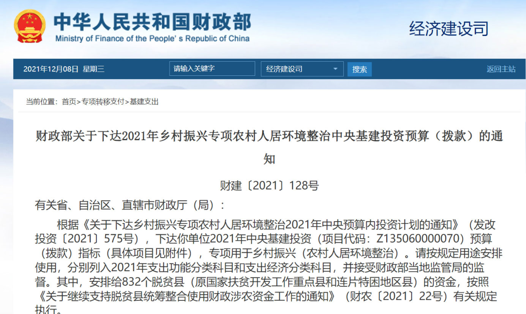 也就是說,農(nóng)村人居環(huán)境整治提升,主要的資金來源還是要靠地方。中央這邊,會(huì)安排一定的中央預(yù)算內(nèi)投資,給予獎(jiǎng)補(bǔ)。查了一下,今年5月12日,財(cái)政部就曾經(jīng)下達(dá)“2021年鄉(xiāng)村振興專項(xiàng)農(nóng)村人居環(huán)境整治中央基建投資預(yù)算(撥款)”,總額為29.6億元.去年8月,財(cái)政部也曾經(jīng)下達(dá)2020年的“農(nóng)村人居環(huán)境整治專項(xiàng)中央基建投資預(yù)算(撥款)”,當(dāng)時(shí)的總額是29.756億元。從這兩年的情況看,每年全國(guó)大概30億吧,這是中央拿出來的錢。地方各級(jí)政府要保障農(nóng)村人居環(huán)境整治基礎(chǔ)設(shè)施建設(shè)和運(yùn)行資金,統(tǒng)籌安排土地出讓收入用于改善農(nóng)村人居環(huán)境,鼓勵(lì)各地通過發(fā)行地方政府債券等方式用于符合條件的農(nóng)村人居環(huán)境建設(shè)項(xiàng)目。看得出來,地方政府的投入,主要來源是兩個(gè):一是土地出讓金,二是發(fā)行地方債。
