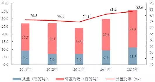 目前,我國工業(yè)危廢處理行業(yè)整體現狀表現為綜合利用水平較高,無害化水平較低,不同細分行業(yè)表現又有所差異。相對來說,資源化利用由于能夠回收資源價值,經濟性較高,產生危廢的企業(yè)還能通過出售危廢獲得收入,因此發(fā)展較快也較為充分。而無害化處置技術復雜、處理難度高,而且對于產生危廢的企業(yè)帶來較大的成本負擔,發(fā)展較為緩慢,甚至還有大量傾倒丟棄事件發(fā)生。根據環(huán)保局的統計數據顯示,2015年我國工業(yè)危廢產生量達到4220萬噸,同比增長16.13%;綜合利用處置率為83.6%,同比增長2.4%。