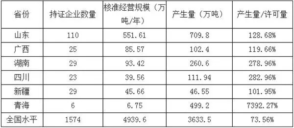 據各省市環(huán)保廳最新數據統計顯示,全國持有危廢處理許可證企業(yè)數近1600家,核準經營規(guī)模約4900萬噸/年。根據環(huán)保部數據統計,2014年度全國危廢產生量為3633.5萬噸。全國平均供給水平在70%多,即產生量除以核準經營規(guī)模在70%多的水平,但區(qū)域之間存在較大差異,低于50%的省份有 8個,多為經濟相對發(fā)達區(qū)域,危廢產生量超過核準經營規(guī)模的省份有6個。下圖是危廢產生量超出核準經營規(guī)模的省份: