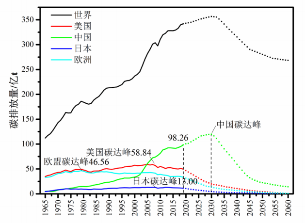 根據(jù)BP數(shù)據(jù),2019年我國二氧化碳排放量為98.26億噸,占世界的28.8%。從我國與歐盟、美國等歷史碳排放量和預(yù)期增長趨勢看(圖1),歐盟、美國、日本在1979年、2007年、2008年已實現(xiàn)碳達峰。我國十八大報告指出,要大力推進生態(tài)文明建設(shè),堅持節(jié)約資源和保護環(huán)境的基本國策,堅持節(jié)約優(yōu)先、保護優(yōu)先、自然恢復(fù)為主的方針,著力推進綠色發(fā)展、循環(huán)發(fā)展、低碳發(fā)展,形成節(jié)約資源和保護環(huán)境的空間格局、產(chǎn)業(yè)結(jié)構(gòu)、生產(chǎn)方式,從源頭上扭轉(zhuǎn)生態(tài)環(huán)境惡化趨勢,為人民創(chuàng)造良好生產(chǎn)生活環(huán)境,為全球生態(tài)安全作出貢獻。