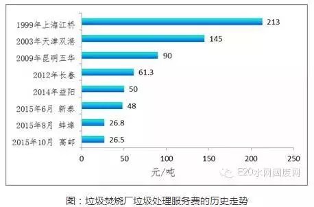 隨著中國(guó)城市化的加速,城市人口大幅增加,城市垃圾量也急劇增多,當(dāng)前,城市生活垃圾累積堆存量已達(dá)70億噸,而全國(guó)垃圾年產(chǎn)量仍以每年8%-10%的速度增長(zhǎng),與GDP增速匹敵,預(yù)計(jì)截止到2020年,城市垃圾產(chǎn)量將達(dá)約3.23億噸。垃圾焚燒發(fā)電是解決“垃圾圍城”的重要方式之一。由于在實(shí)施垃圾焚燒發(fā)電項(xiàng)目前期投資金額大,故一般采取PPP/BOT方式進(jìn)行,項(xiàng)目投資回收主要依靠上網(wǎng)發(fā)電收入及垃圾處理服務(wù)費(fèi)補(bǔ)貼收入。近16年來,垃圾處理的政府補(bǔ)貼費(fèi)用呈現(xiàn)大幅下跌狀態(tài)(如下圖)。