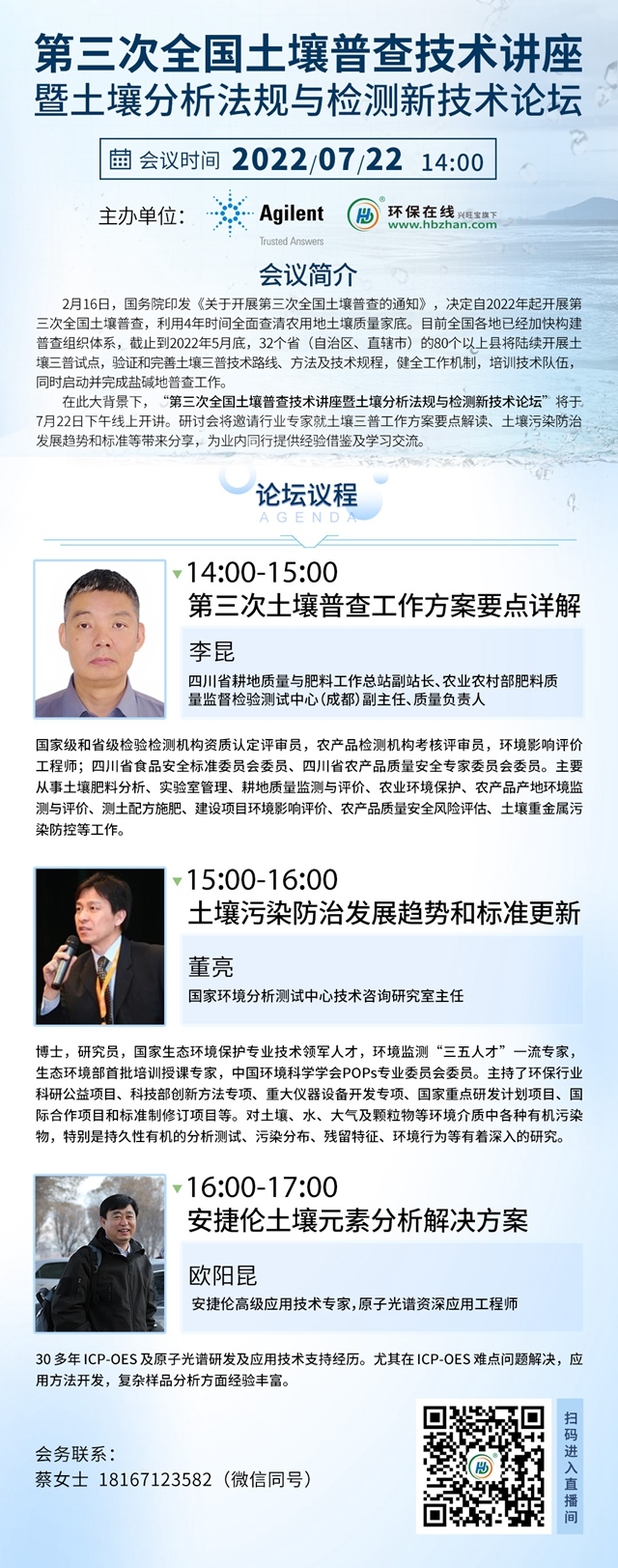 而鑒于我國(guó)土壤污染治理行業(yè)起步晚,技術(shù)門(mén)檻高,環(huán)保在線特聯(lián)合安捷倫于7月22日舉行“第三次全國(guó)土壤普查技術(shù)講座暨土壤分析法規(guī)與檢測(cè)新技術(shù)論壇”,邀請(qǐng)行業(yè)專(zhuān)家就土壤三普工作方案要點(diǎn)解讀、土壤污染防治發(fā)展趨勢(shì)和標(biāo)準(zhǔn)等帶來(lái)分享。