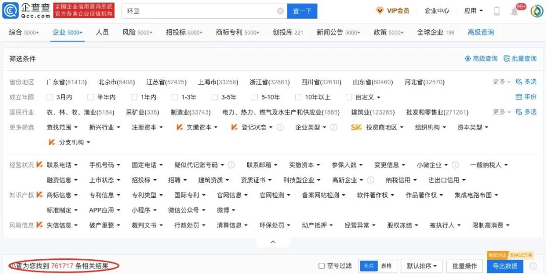 圖1 企查查顯示,全國共有761712家環(huán)衛(wèi)相關企業(yè)