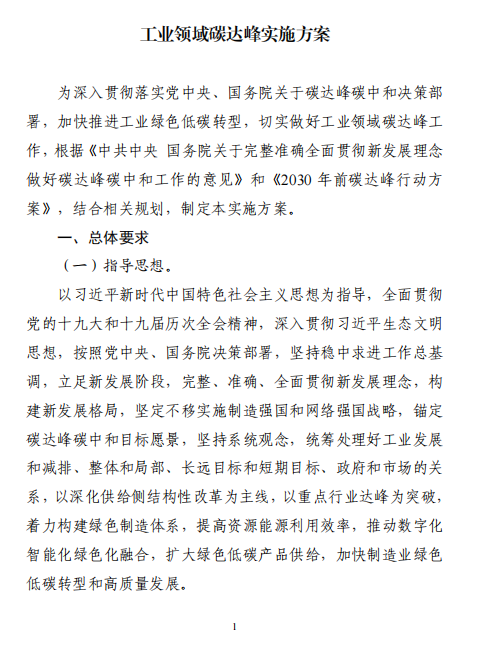 工業(yè)和信息化部 國家發(fā)展改革委 生態(tài)環(huán)境部關(guān)于印發(fā)工業(yè)領(lǐng)域碳達峰實施方案的通知工信部聯(lián)節(jié)〔2022〕88號外交部、科技部、司法部、財政部、住房城鄉(xiāng)建設(shè)部、交通運輸部、商務(wù)部、人民銀行、國資委、稅務(wù)總局、市場監(jiān)管總局、統(tǒng)計局、銀保監(jiān)會、證監(jiān)會、能源局、林草局、郵政局,各省、自治區(qū)、直轄市及計劃單列市、新疆生產(chǎn)建設(shè)兵團工業(yè)和信息化主管部門、發(fā)展改革委、生態(tài)環(huán)境廳(局):《工業(yè)領(lǐng)域碳達峰實施方案》已經(jīng)碳達峰碳中和工作領(lǐng)導(dǎo)小組審議通過,現(xiàn)印發(fā)給你們,請認真貫徹落實。
