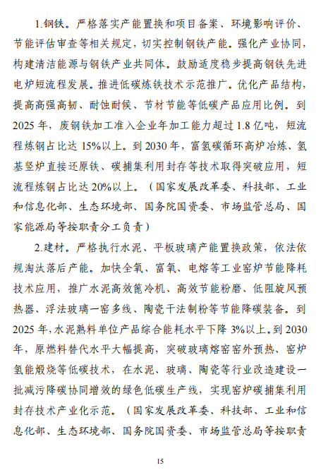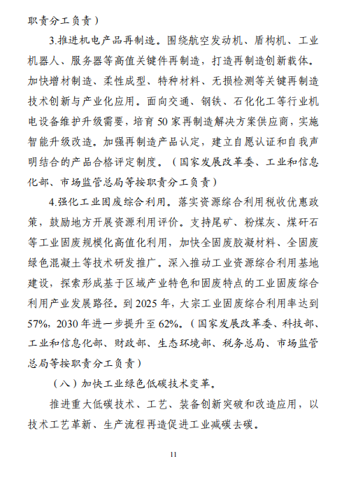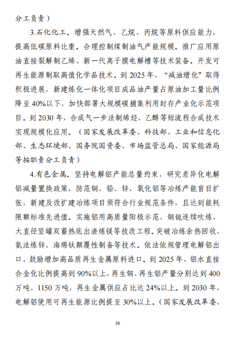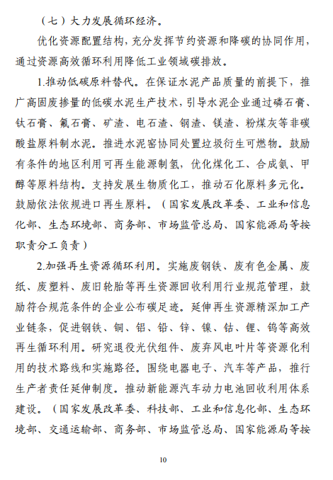 “十五五”期間,產(chǎn)業(yè)結(jié)構(gòu)布局進一步優(yōu)化,工業(yè)能耗強度、二氧化碳排放強度持續(xù)下降,努力達峰削峰,在實現(xiàn)工業(yè)領(lǐng)域碳達峰的基礎(chǔ)上強化碳中和能力,基本建立以高效、綠色、循環(huán)、低碳為重要特征的現(xiàn)代工業(yè)體系。確保工業(yè)領(lǐng)域二氧化碳排放在2030年前達峰。方案指出,加強再生資源循環(huán)利用。實施廢鋼鐵、廢有色金屬、廢紙、廢塑料、廢舊輪胎等再生資源回收利用行業(yè)規(guī)范管理,鼓勵符合規(guī)范條件的企業(yè)公布碳足跡。延伸再生資源精深加工產(chǎn)業(yè)鏈條,促進鋼鐵、銅、鋁、鉛、鋅、鎳、鈷、鋰、鎢等高效再生循環(huán)利用。研究退役光伏組件、廢棄風(fēng)電葉片等資源化利用的技術(shù)路線和實施路徑。圍繞電器電子、汽車等產(chǎn)品,推行生產(chǎn)者責(zé)任延伸制度。推動新能源汽車動力電池回收利用體系建設(shè)。