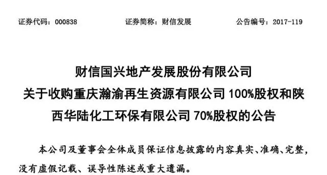 2017年9月29日,財(cái)信國興地產(chǎn)發(fā)展股份有限公司(以下簡稱“財(cái)信發(fā)展”,股票代碼:000838)收購陜西華陸化工環(huán)保有限公司70%股權(quán)(詳見《財(cái)信國興地產(chǎn)發(fā)展股份有限公司關(guān)于收購重慶瀚渝再生資源有限公司100%股權(quán)和陜西華陸化工環(huán)保有限公司70%股權(quán)的公告》),華陸環(huán)保成為財(cái)信發(fā)展的控股子公司。
