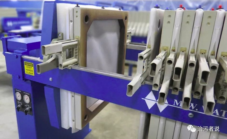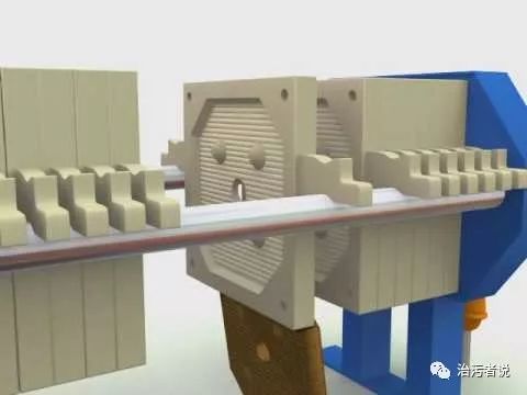 上圖可以看到濾布,濾板,泥餅,濾出液之間的關(guān)系。可以看到板框式壓濾機(jī)更像一臺(tái)不會(huì)轉(zhuǎn)動(dòng)的濾帶壓濾機(jī),通過(guò)固定在濾板上的濾布一次次擠壓,完成了污泥脫水的過(guò)程。