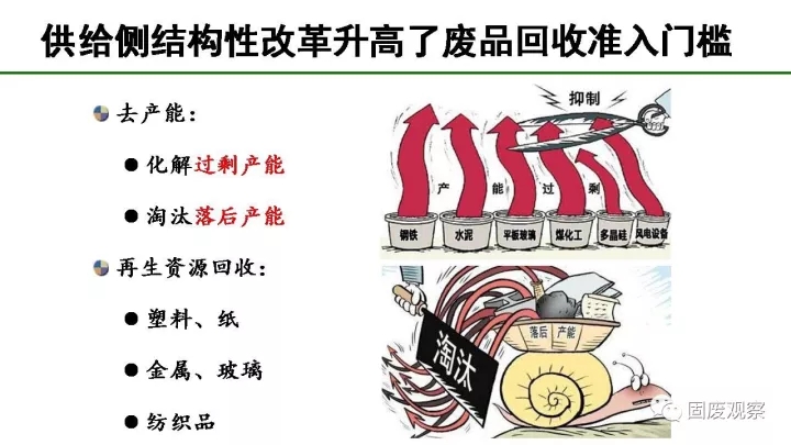 短缺經濟時代與過剩經濟時代,自力更生時代與全球化時代,環(huán)境容量大的時代與環(huán)境容量小的時代,分類回收策略不同。我們目前廢品回收行業(yè)大多只能生產低端產品,但市場越來越小了。相當一批廢品回收企業(yè)屬“散亂污”,以污染環(huán)境為代價維持生產獲取利潤。在此輪環(huán)保督察中,大批廢品回收利用企業(yè)因環(huán)保不達標或無污染防止設施被關停。