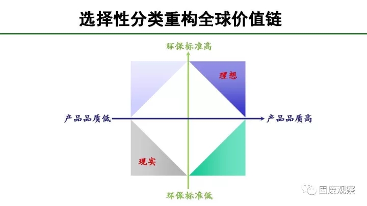 垃圾中的可回收物通常只能降級利用,產業(yè)集聚度和技術含量低,處于全球價值鏈的低端。如果我們僅把這些可回收物當作資源來考慮,為什么發(fā)達國家將產業(yè)鏈最低端的可回收物出口到我們國家,這種不公平的全球價值鏈,我們應該重構!
