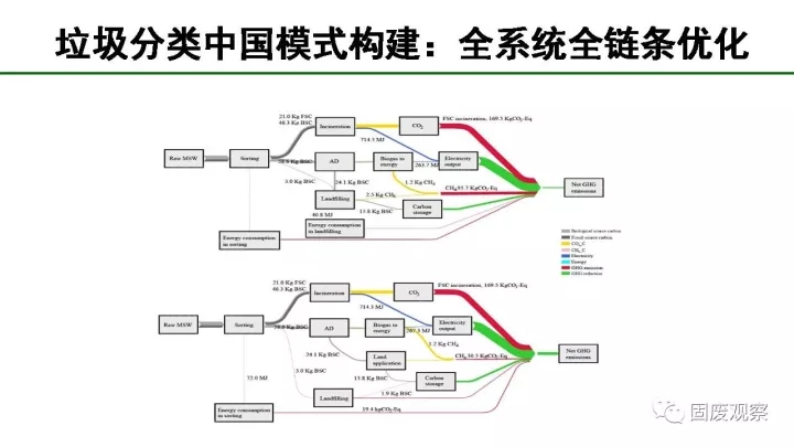 另外,系統(tǒng)性地看待垃圾分類,我們不能為填埋而填埋,為焚燒而焚燒。通過垃圾的物質流,我們可以識別出物質如何流動的,轉化效率如何,是否能被監(jiān)控,下面是我做的一個垃圾的物質流。