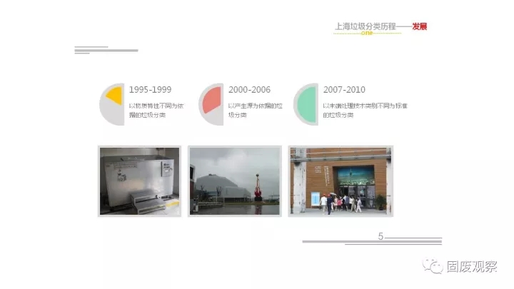 第二階段是發(fā)展階段,從1995年到2010年,上海經(jīng)歷了不同的分類標準,一直在探索,從一開始以物質(zhì)特性為依據(jù)進行垃圾分類,到后來以產(chǎn)生源為依據(jù)分類,再到2007年,上海開始有了垃圾綜合處理的理念,不單填埋一種處置方法,開始有了焚燒和生化處置,因此開始了以末端處理技術(shù)類別來分類。
