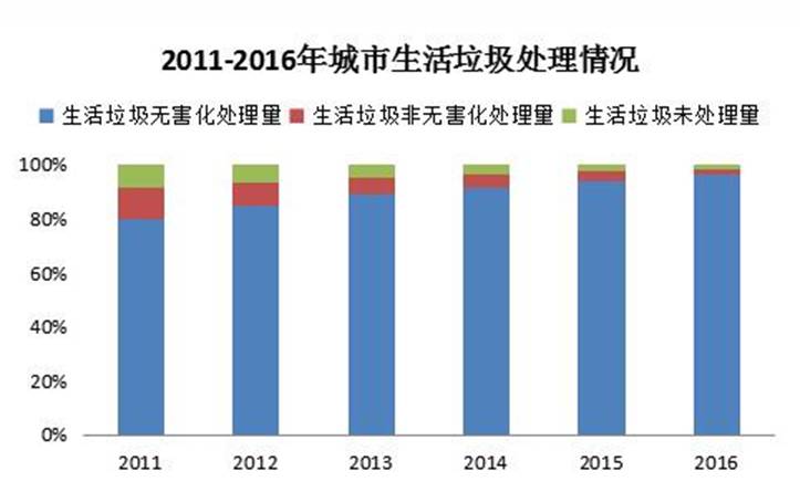 而在35%的要求之下,還存在著相當(dāng)高的生活垃圾處理率:《2017年全國(guó)大、中城市固體廢物污染環(huán)境防治年報(bào)》顯示,2016年,我國(guó)214個(gè)大、中型城市生活垃圾處理率達(dá)99.1%;《2016年城鄉(xiāng)建設(shè)統(tǒng)計(jì)公報(bào)》顯示,到2016年末,全國(guó)城市生活垃圾無害化處理率96.62%。