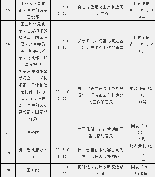 為促進(jìn)全社會(huì)對水泥窯協(xié)同處置廢物特點(diǎn)的認(rèn)識(shí),近年來,中國建筑材料聯(lián)合會(huì)、中國水泥協(xié)會(huì)不斷向政府主管部門提出支持水泥窯協(xié)同處置生活垃圾的政策建議,全國人大代表和政協(xié)委員也不斷提出議案。在政府方面,貴州省政府敢于突破,2013年制定《貴州省推行水泥窯協(xié)同處置生活垃圾實(shí)施方案》,2014年5月,國家發(fā)改委等七部委發(fā)文《關(guān)于促進(jìn)生產(chǎn)過程協(xié)同資源化處理城市及產(chǎn)業(yè)廢棄物工作的意見》,2014年11月全國政協(xié)召開“雙周座談會(huì)”,俞正聲主席親自主持水泥窯協(xié)同處置廢棄物的專題討論,有關(guān)方面都參加了會(huì)議,形成基本共識(shí),即水泥窯協(xié)同處置生活垃圾雖然是與垃圾焚燒發(fā)電競爭的對手,也是對生活垃圾焚燒發(fā)電的補(bǔ)充(例如在不宜發(fā)展垃圾發(fā)電的城市和地區(qū)),更是垃圾焚燒發(fā)電的好幫手(處置垃圾焚燒飛灰)。在各個(gè)方面的努力下,2015年5月,工業(yè)和信息化部等六部委發(fā)文《關(guān)于開展水泥窯協(xié)同處理生活垃圾試點(diǎn)工作的通知》(工信廳聯(lián)節(jié)[2015]第28號(hào)),進(jìn)一步確定了6家企業(yè)為水泥窯協(xié)同處置生活垃圾試點(diǎn)單位。工信部還確定了貴州省為水泥窯協(xié)同處置生活垃圾省級(jí)試點(diǎn)單位,2016年11月在貴州召開了現(xiàn)場工作會(huì)議。