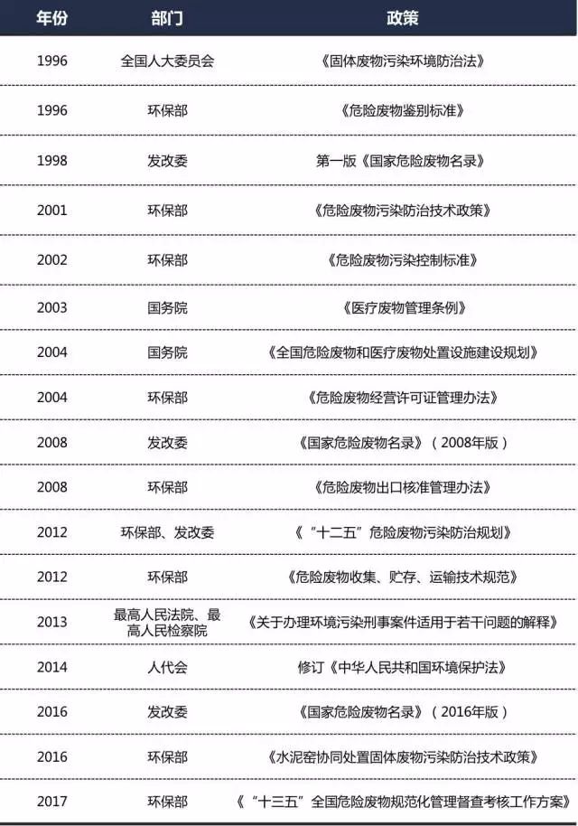 危廢政策不斷出臺,尤其是省級細則落地:1)2017年環(huán)保部出臺“十三五”全國危險廢物規(guī)范化管理督查考核工作方案,各省近期均推出省級危廢規(guī)范化管理督查方案;2)《國家危險廢物名錄》自2016年8月1日起施行;新修訂的《固體廢物污染環(huán)境防治法》取消危險廢物省內(nèi)轉移審批手續(xù);3)2016年最高司法機關就環(huán)境污染犯罪出臺專門司法解釋;4)2018年起實施《環(huán)境保護稅法》,危廢稅額1000元/噸;5)環(huán)保部發(fā)布《水泥窯協(xié)同處置固體廢物污染防治技術政策》,支持水泥窯協(xié)同處置。