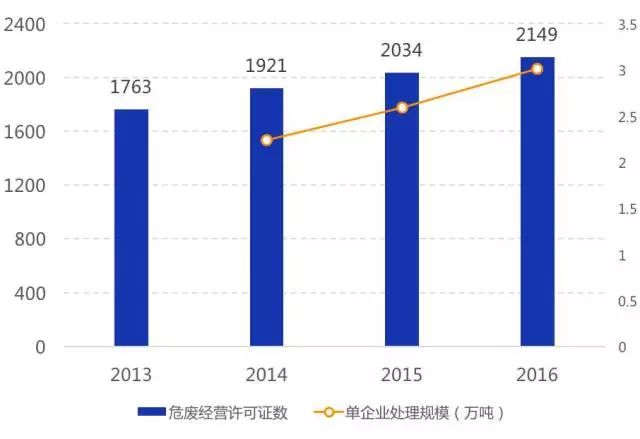 資質(zhì)企業(yè)平均規(guī)模較?。?016年我國持危險廢棄物經(jīng)營許可證的企業(yè)數(shù)量為2149家,2016年凈增加僅115家,體現(xiàn)出環(huán)保系統(tǒng)對新頒發(fā)許可證愈發(fā)謹慎;平均每家處理量僅不到3萬噸,呈現(xiàn)較強的分散性特征,但單企業(yè)處理規(guī)模由2014年2.2萬噸/年增加到2016年3.0萬噸/年,未來隨著許可證頒發(fā)與復核難度加大,實力弱、技術差的小企業(yè)將被淘汰出市場,龍頭擴張,單企業(yè)規(guī)模繼續(xù)擴大。