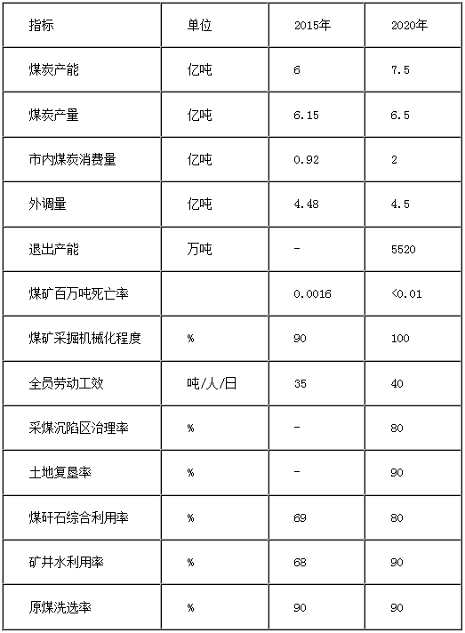 “十三五”期間,在滿足國(guó)內(nèi)煤炭市場(chǎng)需求,保障市內(nèi)煤電、煤化工原料煤炭供應(yīng)的前提下,到2020年,全市原煤產(chǎn)能控制在7.5億噸(預(yù)留1億噸市場(chǎng)調(diào)節(jié)產(chǎn)能);產(chǎn)量控制在6.5億噸左右。堅(jiān)持推進(jìn)煤炭綠色開采,采區(qū)回采率達(dá)到85%以上。推廣充填開采、保水開采和薄煤層開采等綠色開采技術(shù)。