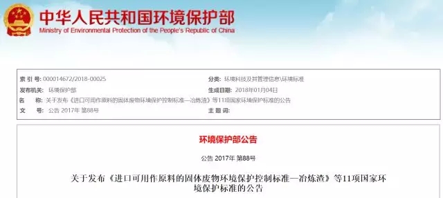 近日,環(huán)境保護部會同國家質(zhì)量監(jiān)督檢驗檢疫總局聯(lián)合發(fā)布了《進口可用作原料的固體廢物環(huán)境保護控制標準—冶煉渣》等11項國家環(huán)境保護標準。新標準自2018年3月1日起正式實施。