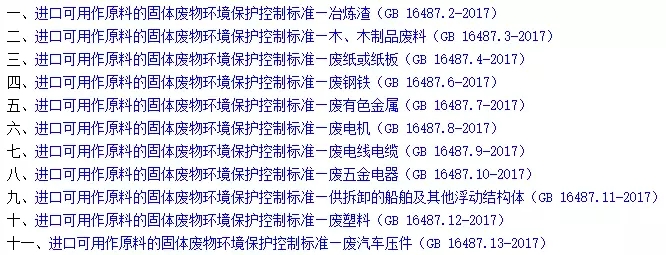 現(xiàn)行環(huán)控標準共有13項(GB 16487.1~GB 16487.13-2005),分別包括骨廢料,冶煉渣,木、木制品廢料,廢紙或紙板,廢纖維,廢鋼鐵,廢有色金屬,廢電機,廢電線電纜,廢五金電器,供拆卸的船舶及其他浮動結(jié)構(gòu)體,廢塑料,廢汽車壓件,各標準控制的重點是夾雜物和放射性污染。