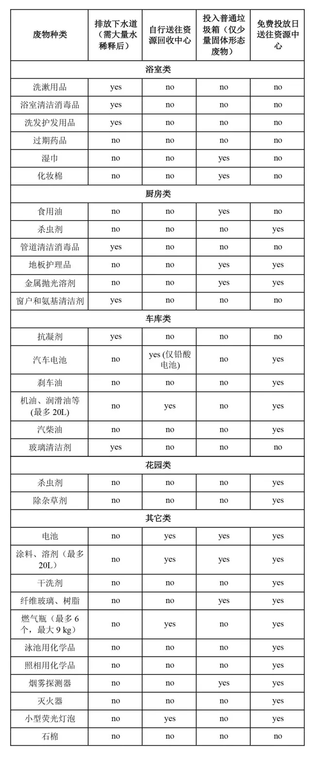 家庭危險廢物包括漂白劑、花園和泳池用化學(xué)品、油漆、溶劑等。居民可打電話給市政部門上門收集,或包裝好送往資源處理中心,但處理都會收費。每年每個區(qū)域(類似我們的街道)都會有兩三次免費日,在這幾天送危險廢物將不收費。由于危險廢物種類繁多,為了便于居民區(qū)分這類廢物與其它廢物,市議會有詳細(xì)的垃圾投放指導(dǎo),如表2所示。