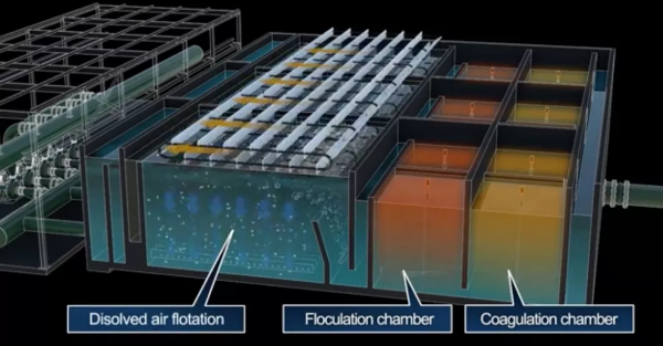 隨后進(jìn)入DAF溶氣氣浮單元,去除油脂和其他初始進(jìn)水中的固體。