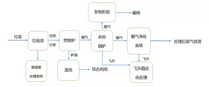 一般而言,不同生活垃圾焚燒廠、不同企業(yè)、不同研究機(jī)構(gòu)開發(fā)的生活垃圾焚燒技術(shù)與城市生活垃圾焚燒工藝流程不盡相同。圖7為城市生活垃圾焚燒發(fā)電系統(tǒng)的一般工藝流程。