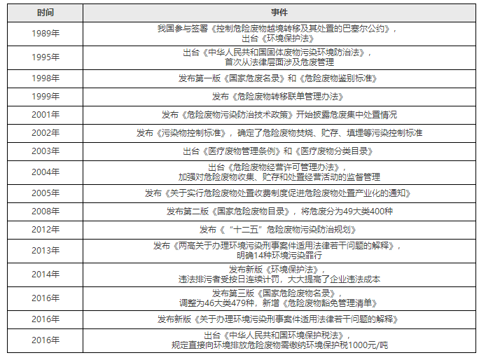 隨著危廢相關(guān)禁令和政策密集出爐,危廢治理市場熱度逐漸提升。我國政府對危廢處置行業(yè)高度重視,迄今已形成以《國家危險廢物名錄》為核心,覆蓋從危廢鑒別、轉(zhuǎn)移、處置到資質(zhì)、監(jiān)管的危廢治理法規(guī)體系。