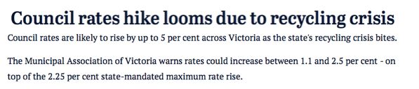 據(jù)《The Age》報道,維州垃圾回收危機(jī)將造成市政費(fèi)上漲高達(dá)5%。市政費(fèi)是市政廳對管轄區(qū)內(nèi)所有業(yè)主(包括居民和企業(yè))征收的費(fèi)用,其中有一部分會用于當(dāng)?shù)氐睦幚怼?/p>