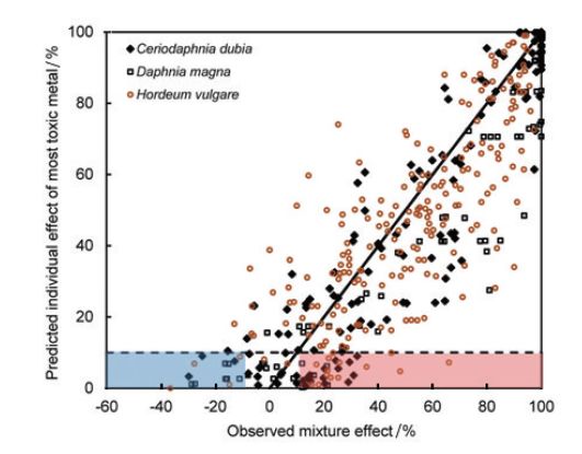土壤重金屬污染對生態(tài)和人體健康的危害,因污染程度、污染元素種類以及暴露途徑的不同而不同。目前相關的環(huán)境風險評估和環(huán)境質(zhì)量標準的主要以單一污染物為基礎,這與土壤重金屬污染常為多元素的復合型污染不盡一致。由于金屬間的相互作用,以及金屬與生物體作用可能表現(xiàn)為協(xié)同、拮抗或無相互作用等,導致多種金屬元素混合比單一元素具有不同的環(huán)境效應。在復合污染生物毒性研究中,常用兩種模型,獨立作用(independentaction)和濃度加和(concentrationaddition)參考模型,前者認為金屬元素毒性作用不同,后者則認為具有相似的作用效果;但是兩個模型均認為污染物在目標點位上沒有相互作用,該假設與實際情況不盡相符。比利時根特大學Nys等通過設定多種金屬復合,開展了30多組大型蚤、模糊網(wǎng)紋蚤和大麥毒性試驗,檢驗在低濃度下獨立作用和濃度加和參考模型適用性。部分重金屬單獨存在對測試生物影響效應在10%以下,而經(jīng)復合后可產(chǎn)生高達66%的抑制作用(圖2);整體上獨立作用參考模型對混合毒性預測精度更高,濃度加和參考模型則更為保守;在風險評估中更為重要的低劑量水平上,用濃度加和參考模型預測的重金屬復合對模糊網(wǎng)紋蚤和大麥毒性比觀測值高1.4~3.6倍。該研究結(jié)果表明,目前所應用的單一重金屬的風險評價,對于重金屬復合情況可能不夠保守。