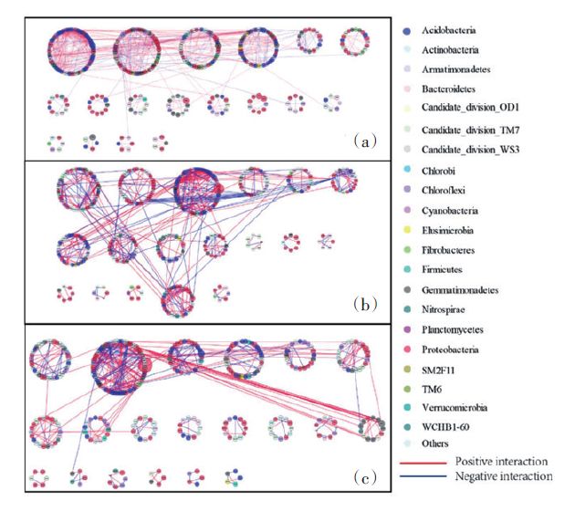 圖9不種植物(a)和種植大豆(b)與玉米(c)對鎘污染土壤細菌網(wǎng)絡關系的影響