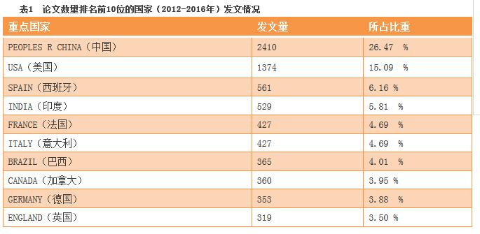 根據(jù)WOS檢索結(jié)果,全世界共有144國家或地區(qū)發(fā)表了土壤污染防治領域相關文獻。其中論文數(shù)量排名在前TOP10的國家(詳見表1)共發(fā)表了5760篇文獻,占總量的63.25%。我國在論文數(shù)量上占有絕對的優(yōu)勢,2012年—2016年共發(fā)表論文2410篇,位居榜首。