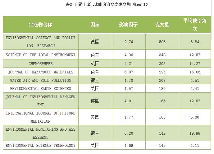 根據(jù)檢索結(jié)果,全球共有736種期刊發(fā)表了土壤污染防治領域的相關論文,該領域內(nèi)發(fā)文量居前10位的期刊如下(表2)。這10種期刊的總發(fā)文量為1157篇,占總量比例為26.25%,平均影響因子3.485。其中,荷蘭占據(jù)4席,美國占據(jù)3席,英國占據(jù)2席,德國占據(jù)1席。并且,影響因子前三名也均屬荷蘭。發(fā)文最多的期刊是德國的《ENVIRONMENTALSCIENCEANDPOLLUTIONRESEARCH》,影響因子最高的期刊是荷蘭的《ENVIRONMENTALMONITORINGANDASSESSMENT》。由此可見,在土壤污染防治相關領域中,荷蘭期刊已達較高的學術水平。