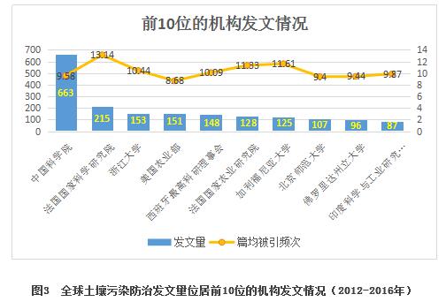 全球共有5420家科研機構或單位發(fā)表了土壤污染防治領域的文獻,發(fā)文量位居前10名的機構或單位以科研機構或者大學為主(見圖3),共發(fā)表1873篇文獻,占該領域發(fā)文總量的20.56%。這10家機構中,中國機構和美國機構數(shù)量最多,各有3個,法國的機構有2個,西班牙和印度機構各有1個。其中中國科學院是發(fā)文數(shù)最多的機構。