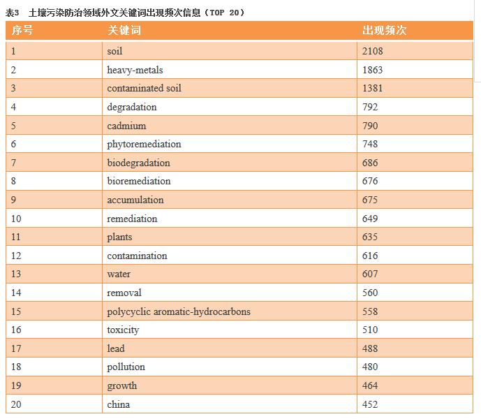 將webofscience上檢索到的9323條英文數(shù)據(jù)導入VOSviewer,共分析了491個關鍵詞,得出的高頻關鍵詞見表3。據(jù)統(tǒng)計,soil(土壤),heavy-metals(重金屬),出現(xiàn)頻次最高,可見重金屬的污染防治一直是領域的關注重點。degradation(退化)排名第四,反映出近5年來土壤退化問題備受關注。此外,植物修復和微生物修復也是近來的研究熱點。