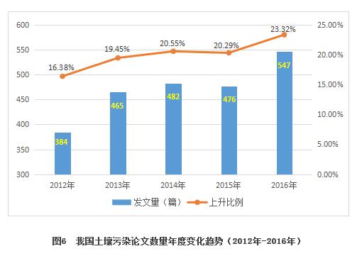 據(jù)統(tǒng)計,中國知網(wǎng)收錄的近5年土壤污染防治核心期刊文獻共2345篇,年度發(fā)文量總體呈上升趨勢(見圖6),上升率由2012年的16.38%升至2016年的23.32%,高出了6.94%,從年度論文數(shù)量的變化中可以看出我國學術界對土壤污染防治的關注度上升,說明我國科研人員越來越重視土壤污染防治的研究。