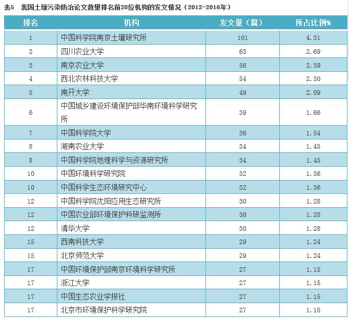 截至2016年發(fā)表的土壤污染防治相關研究論文中,發(fā)文量位居前20位的科研機構或單位見表5。中國科學院南京土壤研究所發(fā)文量101篇,以絕對性優(yōu)勢居榜首,四川農(nóng)業(yè)大學以63篇發(fā)文居第二,南京農(nóng)業(yè)大學以7篇之差位列第三。前20位的機構中,共有10所高校入圍,其中4所是農(nóng)業(yè)類院校;科研機構有9個入圍??梢?,高校和科研機構是我國研究土壤污染防治的主力軍。