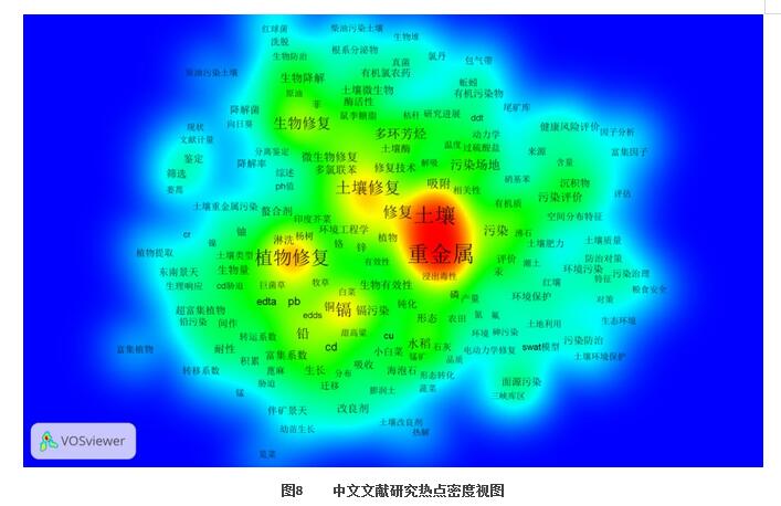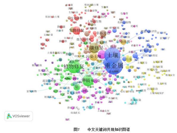 中文關鍵詞共現(xiàn)知識圖譜和熱點圖分別見圖7和圖8,可以發(fā)現(xiàn)該領域研究熱點集中在土壤重金屬防治技術研究,包括鎘、鉻、鋅、鉛、砷和汞及持久性有機污染物,特別是多環(huán)芳烴等的防治技術研究。在包含植物修復與微生物修復的生物修復技術研究方面熱度較高。