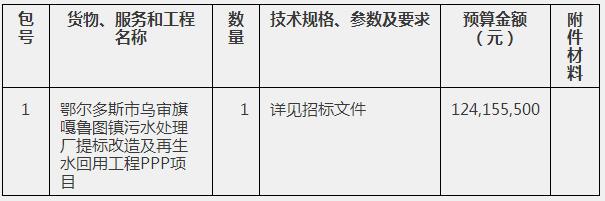 鄂爾多斯市烏審旗嘎魯圖鎮(zhèn)污水處理廠提標(biāo)改造及再生水回用工程PPP項(xiàng)目公開(kāi)招標(biāo),預(yù)算1.24億元。公告如下: