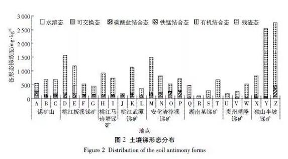 銻的金屬性不強,易形成銻的衍生物(銻化物、氫化物、有機銻化物等),其毒性的大小不僅與其總量有關,很大程度上還取決于其存在形態(tài)。其中單質銻的毒性高于其鹽類,無機銻的毒性高于有機銻,+3 價的毒性高于+5 價(+3 價的毒性大約是+5 價的10 倍),且同等價態(tài)銻的毒性還與其化合物的形態(tài)以及晶體結構有關。銻在土壤中主要以殘渣態(tài)的形式存在,占總銻的比例最高可達90%,水溶態(tài)含量最低(圖 2)。