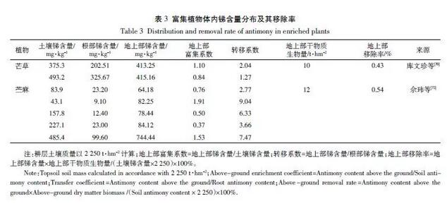 綜上所述,在目前研究較多的2 種銻富集植物中,雖然對銻均有較好的富集效果,但整體移除率不高(移除率基本≤1%),遠低于其他重金屬的富集植物在土壤污染修復中的移除效果(移除率基本≥10%),實際應用潛力不高,尤其是周期較短的農田土壤修復中。