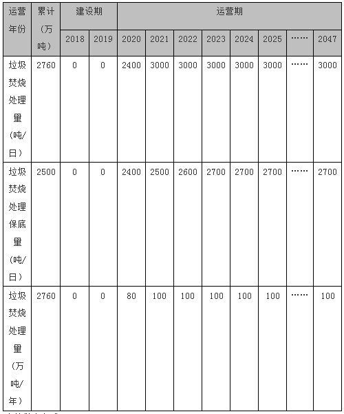 生活垃圾處理量運營期第一年為2400噸/日,以后年份均為3000噸/日處理量,年有效運行時間8000小時,處理量測算見下表:
