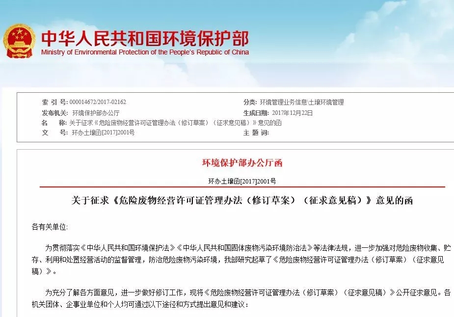 環(huán)境保護(hù)部公布的“關(guān)于征求《危險(xiǎn)廢物經(jīng)營許可證管理辦法(修訂草案)(征求意見稿)》意見的函(環(huán)辦土壤函[2017]2001號),其中,第三十九條 以下危險(xiǎn)廢物利用或者處置活動免于領(lǐng)取危險(xiǎn)廢物經(jīng)營許可證:(一)產(chǎn)生危險(xiǎn)廢物的單位在其廠區(qū)(場所)內(nèi),自行或者委托第三方專業(yè)機(jī)構(gòu)對本單位產(chǎn)生的危險(xiǎn)廢物進(jìn)行利...